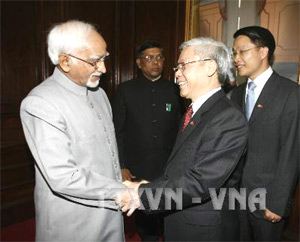 | Phó Tổng thống kiêm Chủ tịch Thượng viện Ấn Độ Hamít Anxari tiếp Chủ tịch Quốc hội Nguyễn Phú Trọng . Ảnh: Trí Dũng - TTXVN |