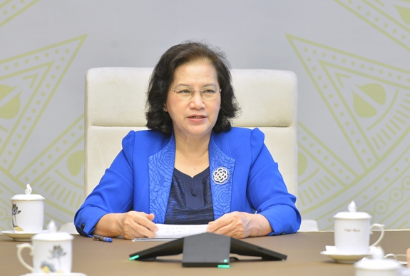 Chủ tịch Quốc hội Nguyễn Thị Kim Ngân và các đại biểu Việt Nam dự cuộc điện đàm. Ảnh: TRỌNG QUỲNH. |