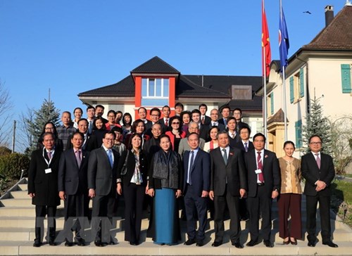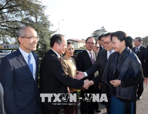 Chủ tịch Quốc hội Nguyễn Thị Kim Ngân đến thăm và nói chuyện với cán bộ, nhân viên Đại sứ quán, gặp gỡ cán bộ, nhân viên phái đoàn và cộng đồng người Việt Nam tại Geneva. Ảnh: TTXVN.