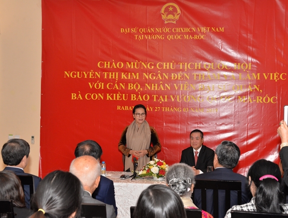 Bày tỏ vui mừng khi gặp gỡ cán bộ, nhân viên Đại sứ quán và đại diện cộng đồng người Việt Nam tại Maroc, Chủ tịch Quốc hội thông báo vắn tắt về tình hình trong nước thời gian gần đây, trong đó nhấn mạnh tới thành tựu phát triển kinh tế, đối ngoại và việc Việt Nam đã tổ chức Hội nghị thượng đỉnh Mỹ-Triều lần thứ hai rất thành công, được bạn bè quốc tế đánh giá rất cao.