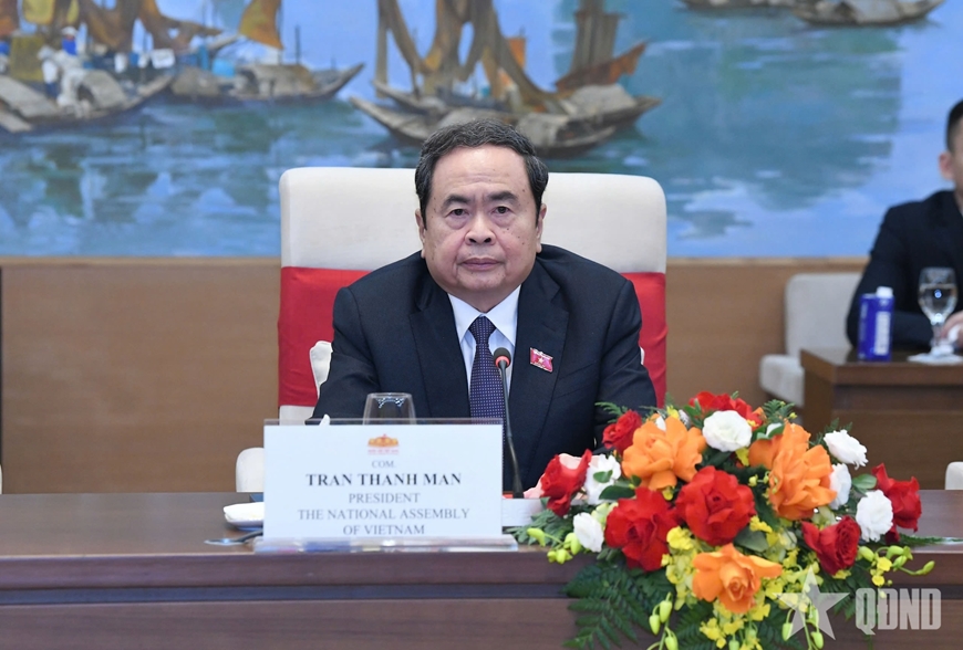 | Chủ tịch Quốc hội Trần Thanh Mẫn phát biểu tại cuộc tiếp. Ảnh: LÂM HIỂN |