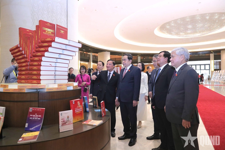 | Chủ tịch Quốc hội Trần Thanh Mẫn và các đại biểu tham quan triển lãm “Quốc hội Việt Nam-Quá trình xây dựng và hoàn thiện hệ thống pháp luật” trong khuôn khổ diễn đàn. |