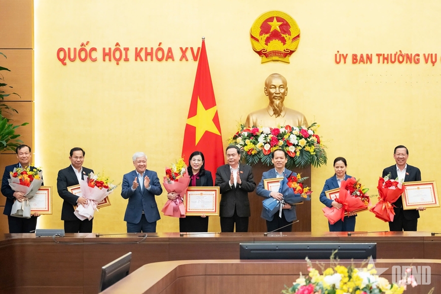 | Chủ tịch Quốc hội Trần Thanh Mẫn và Phó chủ tịch Thường trực Quốc hội Đỗ Văn Chiến trao bằng khen, tặng hoa của Ủy ban Thường vụ Quốc hội tới 6 tập thể có thành tích xuất sắc trong tham mưu phục vụ Kỳ họp thứ mười, Quốc hội Khóa XV. Ảnh: HỒ LONG |
