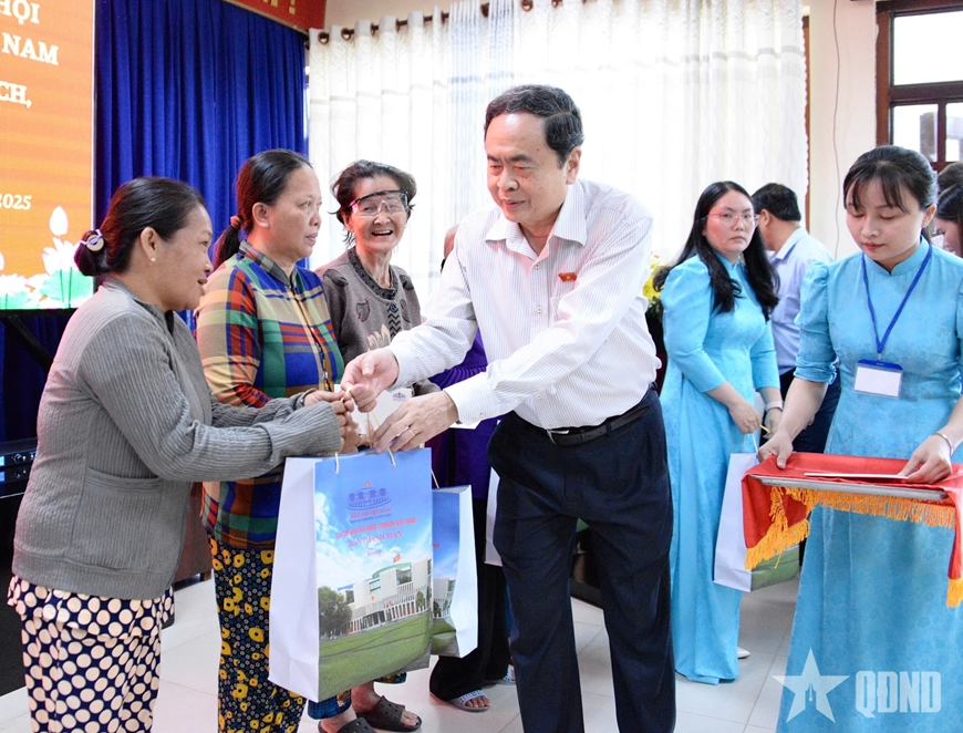 Chủ tịch Quốc hội Trần Thanh Mẫn trao quà tặng hộ gia đình chính sách, người có công của xã Mỹ Hòa Hưng. |