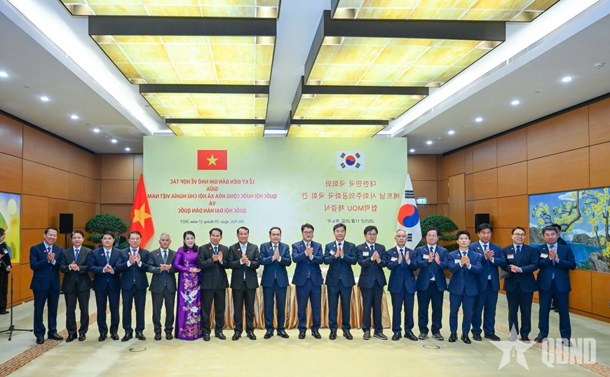 | Chủ tịch Quốc hội Trần Thanh Mẫn và Chủ tịch Quốc hội Hàn Quốc Woo Won Shik cùng các đại biểu tại Lễ ký biên bản ghi nhớ về hợp tác giữa Quốc hội Việt Nam và Quốc hội Đại Hàn Dân Quốc. |