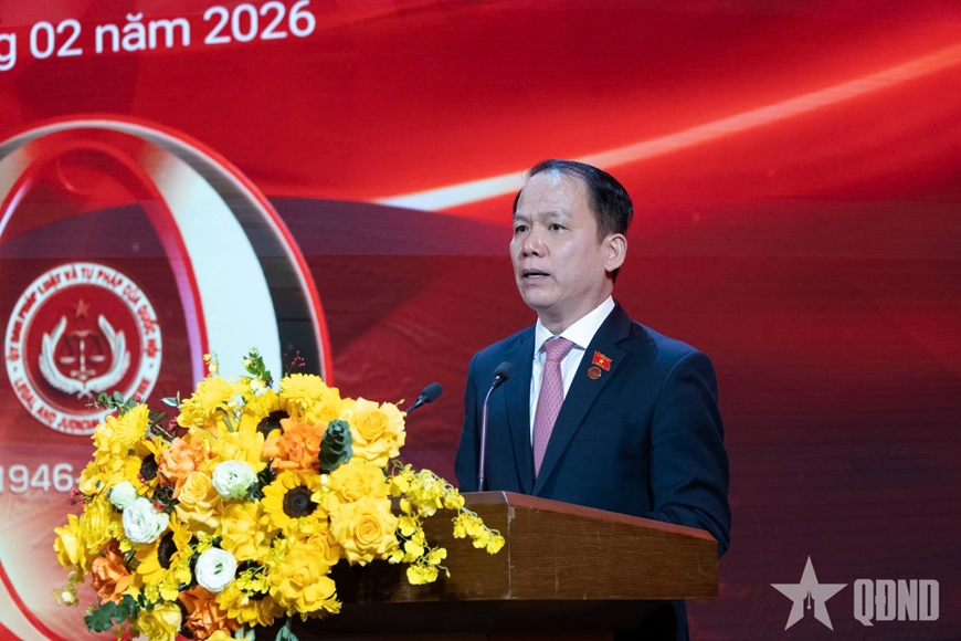 | Chủ nhiệm Ủy ban Pháp luật và Tư pháp của Quốc hội Hoàng Thanh Tùng trình bày diễn văn kỷ niệm. Ảnh: HỒ LONG |