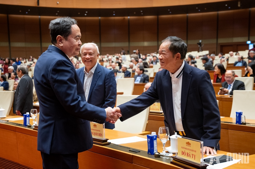 | Chủ tịch Quốc hội Trần Thanh Mẫn và các đồng chí nguyên lãnh đạo Đảng, Nhà nước và các đại biểu tại gặp mặt. Ảnh: PHẠM THẮNG |