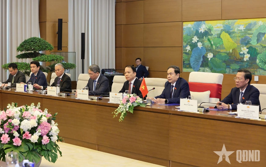 | Chủ tịch Quốc hội Trần Thanh Mẫn và các đại biểu đoàn Việt Nam tham dự cuộc hội kiến. |