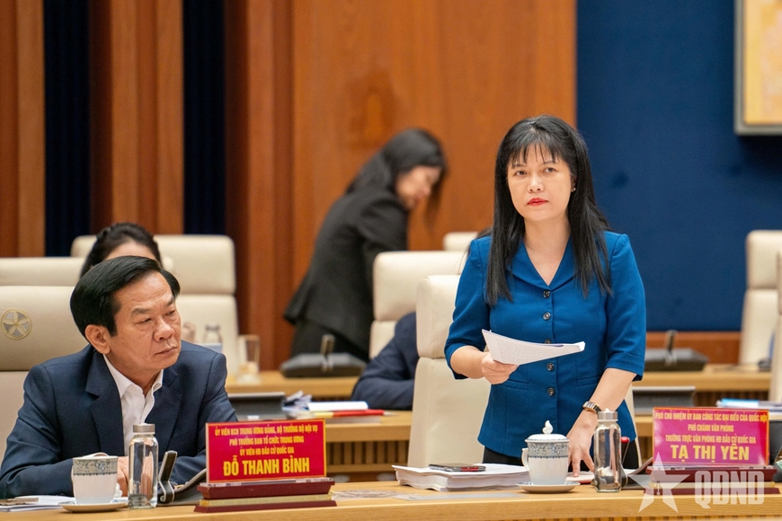 | Đồng chí Tạ Thị Yên, Phó chủ nhiệm Ủy ban Công tác đại biểu của Quốc hội, Phó chánh văn phòng thường trực Văn phòng Hội đồng Bầu cử quốc gia phát biểu tại cuộc làm việc. Ảnh: TIẾN CƯỜNG |