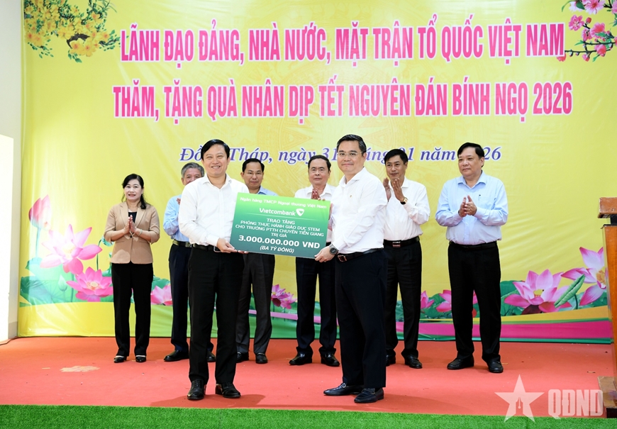 Nhân dịp này, Chủ tịch Quốc hội Trần Thanh Mẫn và đoàn công tác đã chứng kiến lãnh đạo Ngân hàng Thương mại cổ phần Ngoại thương Việt Nam (Vietcombank) trao biển tượng trưng hỗ trợ 3 tỷ đồng xây dựng phòng học STEM tặng trường THPT chuyên Tiền Giang; đồng thời trực tiếp trao quà Tết cho các cán bộ, chiến sĩ lực lượng vũ trang, gia đình chính sách, người có công, hộ nghèo, cận nghèo, công nhân lao động có hoàn cảnh khó khăn trên địa bàn tỉnh./.