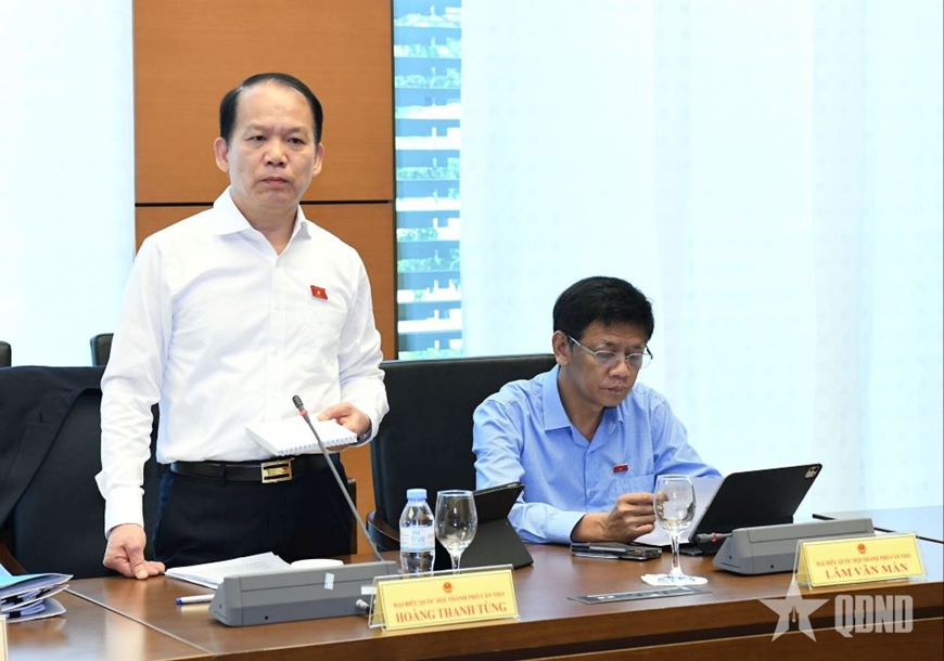 Chủ nhiệm Ủy ban Pháp luật và Tư pháp của Quốc hội Hoàng Thanh Tùng phát biểu tại Tổ 11. Ảnh: LÂM HIỂN |