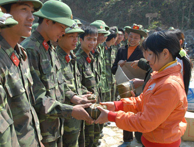 | Người dân mang bánh, thực phẩm cho bộ đội |