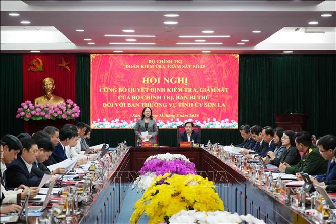 Đại diện đoàn công tác đã thông báo Quyết định số 29-QĐNS/TW ngày 23-2-2026 của Bộ Chính trị về thành lập Đoàn kiểm tra, giám sát đối với Ban Thường vụ Tỉnh ủy Sơn La; kế hoạch, đề cương báo cáo và dự kiến kế hoạch làm việc của đoàn kiểm tra, giám sát. Theo đó, đoàn công tác giám sát việc lãnh đạo, chỉ đạo, tổ chức nghiên cứu, học tập, quán triệt, tuyên truyền và triển khai Nghị quyết Đại hội XIV của Đảng; việc lãnh đạo, chỉ đạo, thực hiện Chỉ thị số 01-CT/TW, ngày 23-1-2026 của Bộ Chính trị về nghiên cứu, học tập, quán triệt, tuyên truyền và triển khai Nghị quyết Đại hội đại biểu toàn quốc lần thứ XIV của Đảng; Chỉ thị số 46-CT/TW, ngày 16-5-2025 của Bộ Chính trị về lãnh đạo cuộc bầu cử đại biểu Quốc hội và bầu cử đại biểu Hội đồng nhân dân các cấp nhiệm kỳ 2026-2031.