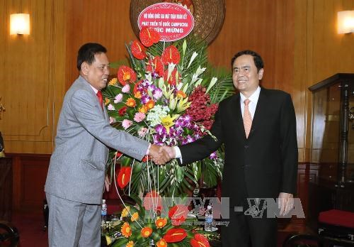 Ông Nhem Valy tặng hoa chúc mừng tân Chủ tịch Uỷ ban Trung uơng Mặt trận Tổ quốc Việt Nam Trần Thanh Mẫn. Ảnh: Nguyễn Dân - TTXVN