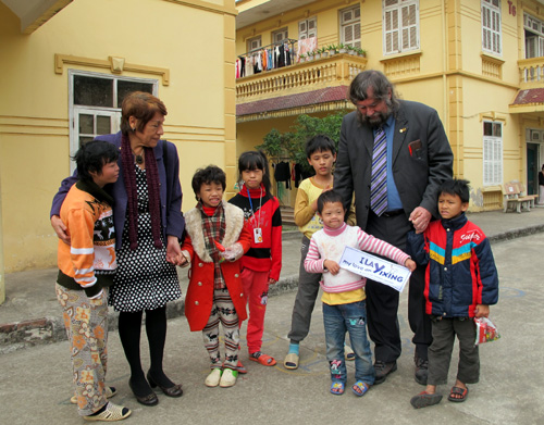 Sau khi trao quà cho đại diện Làng Hữu nghị Việt Nam, ông James Rhodes và vợ đã đi thăm nơi sinh hoạt, trò chuyện với các em nhỏ và cựu chiến binh đang điều trị tại đây.