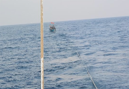Lai dắt tàu ĐNa 37096 TS về bờ. Ảnh: Danang MRCC cung cấp