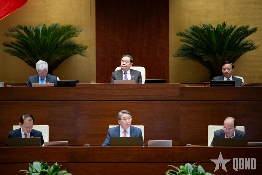Đoàn chủ tịch và Đoàn thư ký Phiên họp Quốc hội tại hội trường, sáng 11-11. Ảnh: TRỌNG HẢI