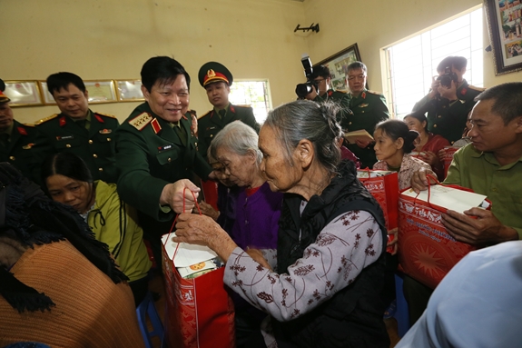 Đại tướng Ngô Xuân Lịch trao quà tặng các đối tượng chính sách và hộ nghèo. Ảnh: Văn Tuấn. |
