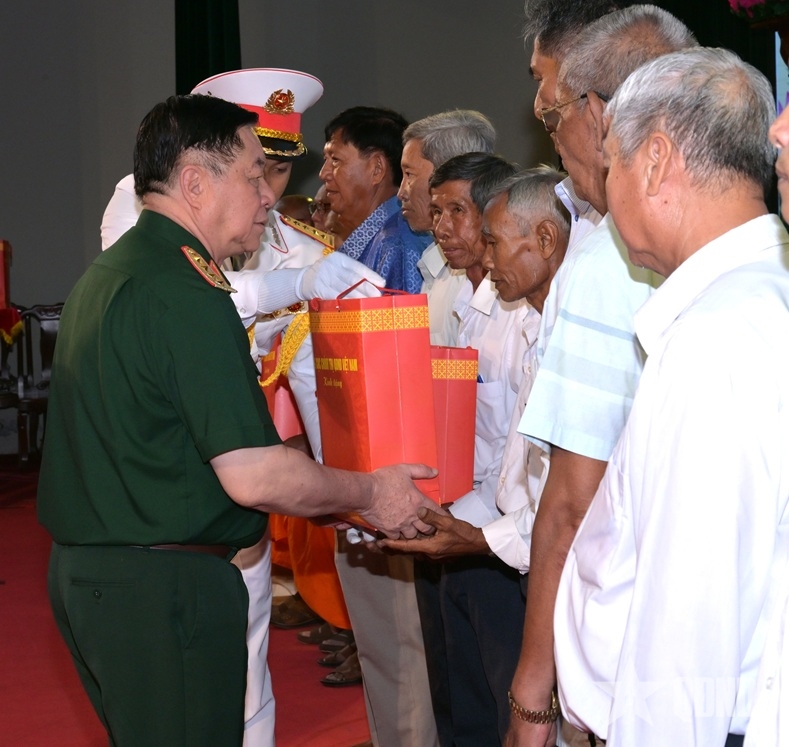 | Thượng tướng Phạm Trường Sơn, Phó tổng Tham mưu trưởng, lãnh đạo Ban Tuyên giáo và Dân vận Trung ương tặng quà các đại biểu. |