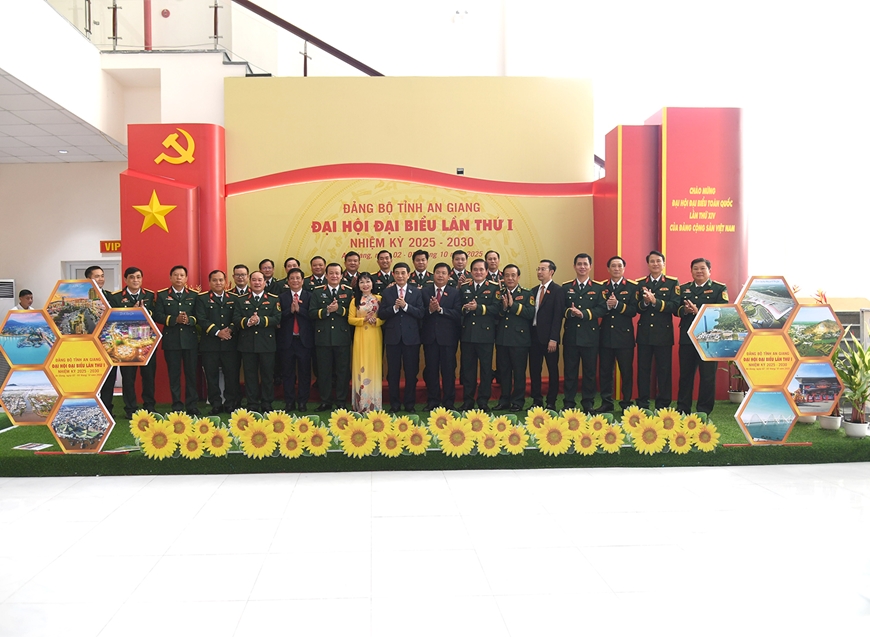 Đại tướng Phan Văn Giang, Ủy viên Bộ Chính trị, Phó bí thư Quân ủy Trung ương, Bộ trưởng Bộ Quốc phòng chụp ảnh cùng các đại biểu tại Đại hội đại biểu Đảng bộ tỉnh An Giang lần thứ I, nhiệm kỳ 2025-2030. |