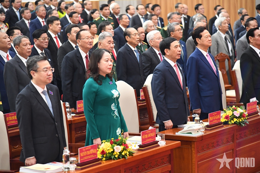 Đại tướng Phan Văn Giang, Ủy viên Bộ Chính trị, Phó bí thư Quân ủy Trung ương, Bộ trưởng Bộ Quốc phòng và các đại biểu tại Đại hội đại biểu Đảng bộ tỉnh An Giang lần thứ I, nhiệm kỳ 2025-2030.