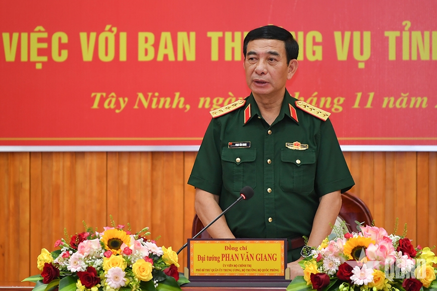Phát biểu kết luận tại buổi làm việc, Đại tướng Phan Văn Giang bày tỏ vui mừng với những kết quả mà Đảng bộ, chính quyền, lực lượng vũ trang và nhân dân tỉnh Tây Ninh đã đạt được trong thời gian qua trên các lĩnh vực kinh tế-xã hội, quốc phòng, an ninh và đối ngoại nhân dân. Để hoàn thành tốt chỉ tiêu phát triển kinh tế-xã hội gắn với tăng cường quốc phòng, an ninh trên địa bàn, Đại tướng Phan Văn Giang đề nghị Tỉnh ủy Tây Ninh tập trung lãnh đạo, chỉ đạo thực hiện một số trọng tâm. Trong đó, tiếp tục quán triệt sâu sắc đường lối, chủ trương của Đảng, chính sách, pháp luật của Nhà nước, chỉ thị, nghị quyết của Quân ủy Trung ương, Bộ Quốc phòng về nhiệm vụ bảo vệ Tổ quốc. Nâng cao tinh thần cảnh giác cách mạng; chủ động đấu tranh làm thất bại âm mưu, hoạt động "diễn biến hòa bình" của các thế lực thù địch. Tập trung lãnh đạo, chỉ đạo thực hiện có hiệu quả Nghị quyết Trung ương 4 khóa XI, khóa XII và Kết luận số 21-KL/TW ngày 25-10-2021 của Ban Chấp hành Trung ương về đẩy mạnh xây dựng, chỉnh đốn Đảng và hệ thống chính trị. Đẩy mạnh học tập và làm theo tư tưởng, đạo đức, phong cách Hồ Chí Minh. Thực hiện tốt quy định nêu gương, nhất là cán bộ chủ trì, chủ chốt các cấp. Chăm lo xây dựng, đào tạo đội ngũ cán bộ lãnh đạo, quản lý các cấp có phẩm chất và năng lực đáp ứng yêu cầu xây dựng, phát triển của tỉnh.