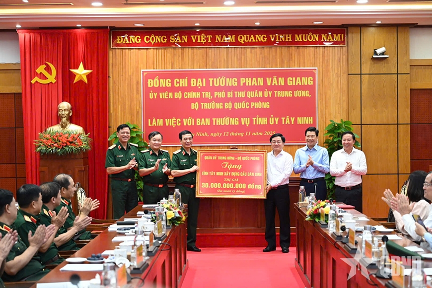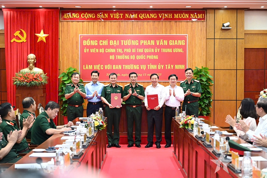 Kết thúc buổi làm việc, Đại tướng Phan Văn Giang chứng kiến trao thỏa thuận hợp tác chiến lược giai đoạn 2026-2030 giữa Tập đoàn Công nghiệp-Viễn thông Quân đội (Viettel) và UBND tỉnh Tây Ninh; trao bảng tượng trưng của Quân ủy Trung ương, Bộ Quốc phòng tặng tỉnh Tây Ninh xây dựng cầu dân sinh trị giá 30 tỷ đồng.