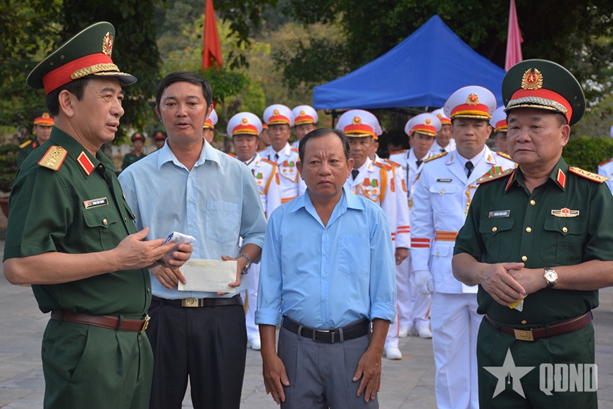 | Đại tướng Phan Văn Giang trao quà của Quân ủy Trung ương, Bộ Quốc phòng và Bộ tư lệnh Quân khu 7 tặng Ban quản trang. |