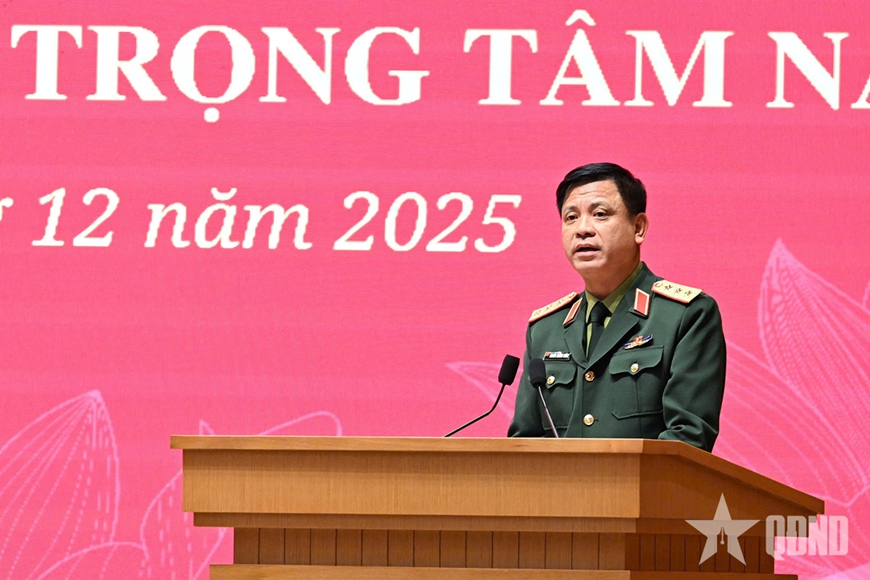 | Thượng tướng Nguyễn Trường Thắng trình bày ý kiến tham luận tại hội nghị. Ảnh: VIỆT TRUNG |