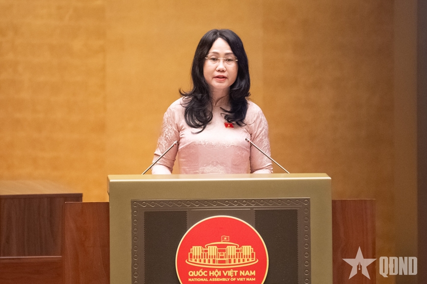 | Bộ trưởng Bộ Văn hóa, Thể thao và Du lịch Lâm Thị Phương Thanh báo cáo tại phiên họp. Ảnh: TRỌNG HẢI |
