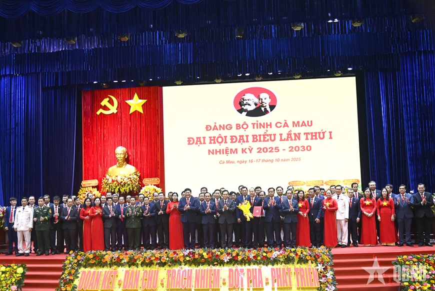 Các đại biểu cùng Ban Chấp hành Đảng bộ tỉnh Cà Mau nhiệm kỳ 2025-2030 chụp ảnh chung. |