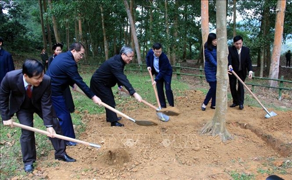 Đồng chí Trần Quốc Vượng, Ủy viên Bộ Chính trị, Thường trực Ban Bí thư trồng cây lưu niệm tại Khu di tích Khuân Điển, xã Kim Quan, huyện Yên Sơn, tỉnh Tuyên Quang. Ảnh: TTXVN. |