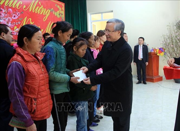 Đồng chí Trần Quốc Vượng, Ủy viên Bộ Chính trị, Thường trực Ban Bí thư tặng quà cho hộ gia đình chính sách, hộ nghèo của xã Kim Quan, huyện Yên Sơn, tỉnh Tuyên Quang. Ảnh: TTXVN. |