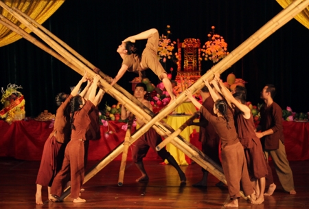 Tiết mục biểu diễn xiếc “Làng tôi” của nghệ sĩ Liên đoàn xiếc Việt Nam trong Lễ giỗ tổ ngành Sân khấu 2015.