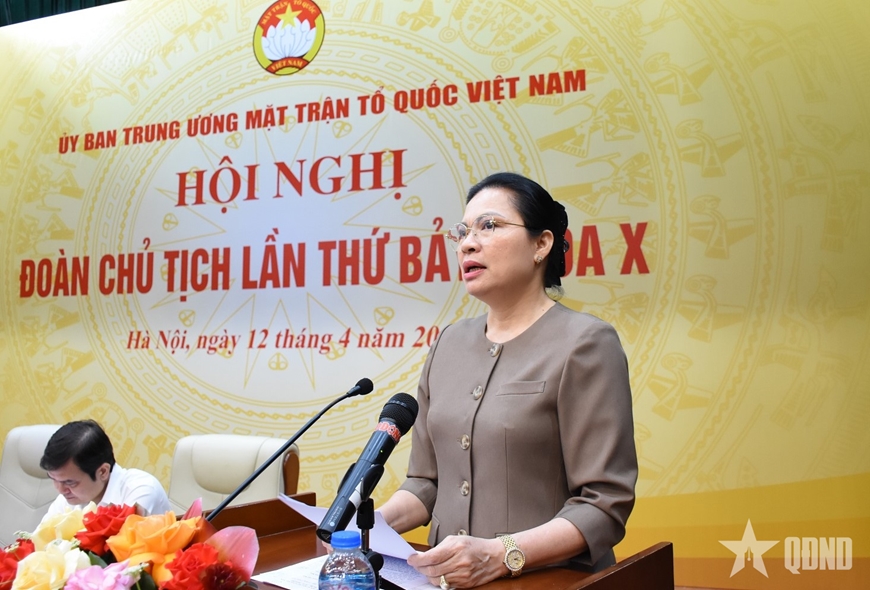 Đồng chí Hà Thị Nga, Ủy viên Trung ương Đảng, Phó chủ tịch, Tổng thư ký Ủy ban Trung ương Mặt trận Tổ quốc Việt Nam trình bày nội dung Tờ trình tại Hội nghị.