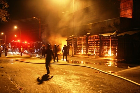 Các ki ốt bán quần áo, chăn màn bốc cháy ngùn ngụt. Ảnh: dantri.com.vn