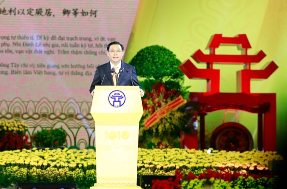 Phát biểu tại buổi lễ, đồng chí Vương Đình Huệ nhắc lại sự kiện Đức vua Lý Thái Tổ với tầm nhìn chiến lược đã quyết định dời đô từ Hoa Lư (Ninh Bình) về Thành Đại La (tức Thăng Long), vùng đất có “thế rồng cuộn hổ ngồi”, “núi sông sau trước”, “chốn hội tụ trọng yếu của bốn phương đất nước, nơi đóng đô bậc nhất của kinh sư muôn đời” cách đây 1010 năm trước. Từ mốc son lịch sử đó tới Thời đại Hồ Chí Minh quang vinh, trải qua bao thăng trầm, Thăng Long - Hà Nội là hình tượng tiêu biểu nhất cho “khí phách cha ông, hồn thiêng sông núi” vẫn luôn vững vàng, hiên ngang, xứng đáng là kinh đô của các vương triều; là Thủ đô ngàn năm văn hiến, anh hùng của cả nước.