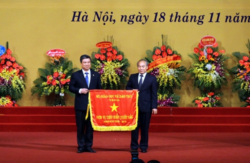 Thứ trưởng Bộ GD-ĐT Nguyễn Vinh Hiển (bên phải) trao Cờ Đơn vị tiêu biểu xuất sắc cho Sở GD-ĐT Hà Nội.
