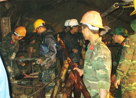 Cán bộ, chiến sĩ công binh tham gia mở đường hầm cứu nạn thứ hai trong đêm 18-12.