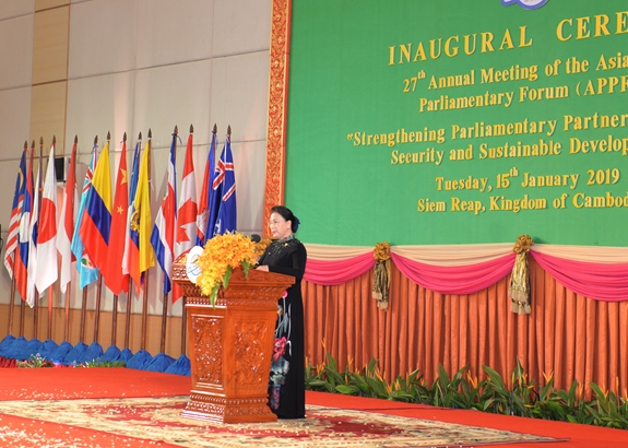 Tại APPF 27, Quốc hội Việt Nam đánh giá cao chủ đề của Hội nghị lần này là“Tăng cường quan hệ đối tác nghị viện vì hòa bình, an ninh và phát triển bền vững”, phù hợp với định hướng quan hệ đối tác nghị viện, yêu cầu và xu thế phát triển của toàn cầu nói chung và khu vực châu Á - Thái Bình Dương nói riêng trong giai đoạn mới. Kiên trì các mục tiêu độc lập, tự chủ, đối thoại và hợp tác trên cơ sở luật pháp quốc tế và Hiến chương Liên Hợp quốc là nền tảng căn bản để giữ vững hòa bình, an ninh và phát triển. “Điều quan trọng hơn cả là những mục tiêu phát triển bền vững phải được trở thành định hướng thường xuyên, lâu dài cho các chính sách phát triển của các quốc gia; xuất phát từ nguyện vọng của người dân, bảo đảm được lợi ích của người dân mà chúng ta là những người đại diện”, Chủ tịch Quốc hội Nguyễn Thị Kim Ngân nói.