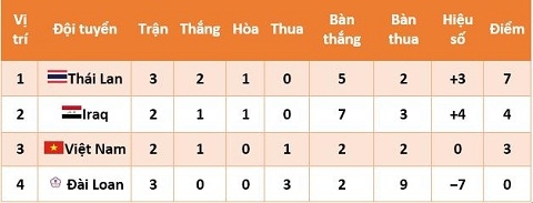 Hiện tại, ĐT Thái Lan đứng đầu bảng F với 7 điểm. Xếp sau là Iraq (4 điểm), ĐTVN (3 điểm) và ĐT Đài Loan (Trung Quốc) đứng cuối bảng. ĐT Việt Nam và Iraq mới thi đấu 2 trận, trong khi đó Thái Lan và Đài Loan đã đá 3 trận.