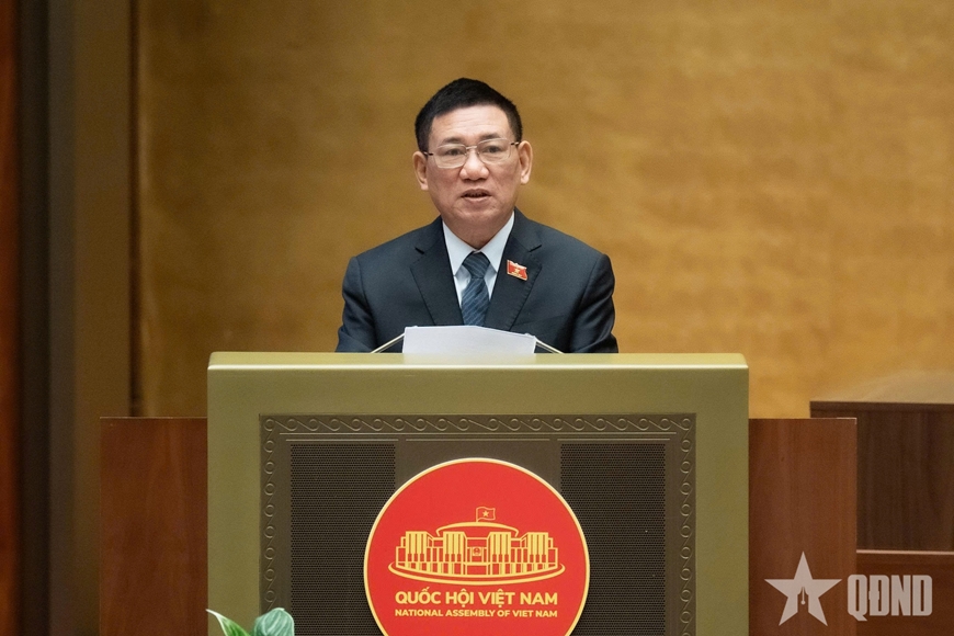| Chủ nhiệm Ủy ban Quốc phòng, An ninh và Đối ngoại của Quốc hội Lê Tấn Tới báo cáo tại Quốc hội. |