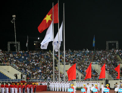 Cờ của nước chủ nhà và đại hội tung bay trên bầu trời Hà Nội.