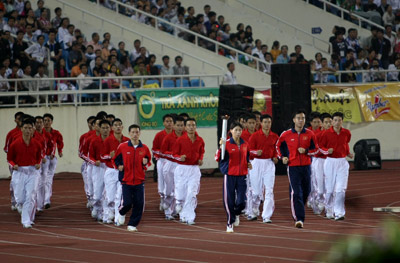 Vận động viên Bùi Thị Nhung cùng các gương mặt ưu tú đại diện của thể thao Việt Nam rước đuốc đại hội vào lễ đài.