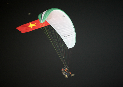 Dù bay mang cờ của nước chủ nhà bay qua khu vực Sân vận động Quốc gia Mỹ Đình trong đêm khai mạc.