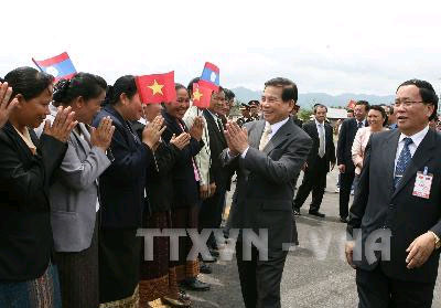 Nhân dân tỉnh Luông Nậm-thà nồng nhiệt chào đón Chủ tịch nước Nguyễn Minh Triết. Ảnh: TTXVN
