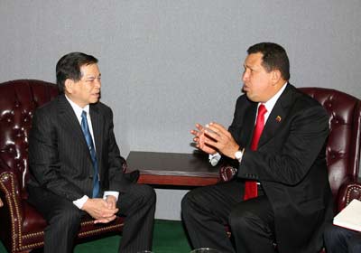 | Ngày 24 - 9- 2009, Chủ tịch nước Nguyễn Minh Triết đã có cuộc gặp gỡ song phương với Tổng thống Vê-nê-du-ê-la,Hu-gô Cha-vét.Ảnh: Nguyễn Khang-TTXVN |