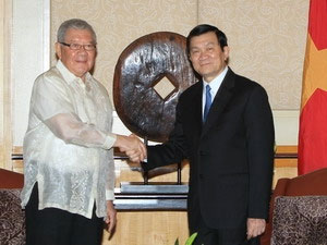 | Chủ tịch nước Trương Tấn Sang tiếp Chủ tịch Hạ viện Philippines Feliciano Belmonte. (Ảnh: Nguyễn Khang/TTXVN) |