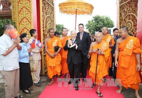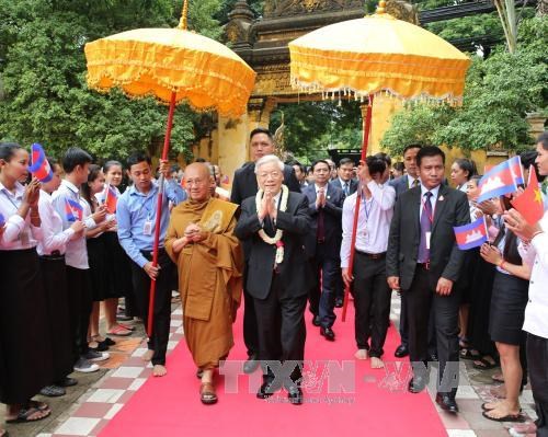 Cũng nhân đây, Tổng Bí thư thông tin về tình hình hoạt động của Phật giáo Việt Nam; đánh giá cao mối quan hệ truyền thống tốt đẹp giữa Phật giáo hai nước; mong muốn Phật giáo Cam-pu-chia thường xuyên thăm viếng, trao đổi kinh nghiệm với Phật giáo Việt Nam. Tổng Bí thư tin tưởng quan hệ đoàn kết hữu nghị, hợp tác truyền thống giữa hai nước, trong đó có Phật giáo Việt Nam và Phật giáo Cam-pu-chia sẽ được giữ gìn, trao truyền cho muôn đời, để con cháu mai sau của hai dân tộc vui hưởng thái bình, phồn vinh, hạnh phúc.