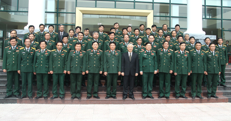 Trung tướng Nguyễn Tiến Quốc, Giám đốc Học viện đã báo cáo với Tổng bí thư về quá trình hình thành và những thành quả đạt được trong thời gian qua của học viện. Tháng 7-1951, nhằm bảo đảm cho quân đội hoàn thành thắng lợi mọi nghiệm vụ, Tổng Quân uỷ quyết định thành lập Trường Chính trị trung cấp Quân đội nhân dân Việt Nam (tiền thân của Học viện Chính trị ngày nay) và cử đồng chí Nguyễn Chí Thanh, Chủ nhiệm Tổng cục Chính trị làm giám đốc, đồng chí Võ Hồng Cương làm Phó giám đốc trực tiếp phụ trách nhà trường. Trải qua 60 năm xây dựng và phát triển, Học viện Chính trị đã trở thành trung tâm giáo dục đào tạo, nghiên cứu khoa học hàng đầu của quân đội và của quốc gia. Học viện đã đào tạo được hàng vạn cán bộ chính trị, giảng viên, cán bộ nghiên cứu khoa học xã hội nhân văn cho các cơ quan, đơn vị, nhà trường, trung tâm nghiên cứu trong và ngoài cuân đội. Lớp lớp cán bộ được đào tạo từ Học viện đã và đang thực hiện tốt chức trách, nhiệm vụ được giao, góp phần tích cực vào việc giữ vững, tăng cường sự lãnh đạo tuyệt đối, trực tiếp về mọi mặt của Đảng đối với quân đội, xây dựng quân đội về chính trị. Nhiều đồng chí đã được phong quân hàm cấp tướng, phát triển lên những cương vị lãnh đạo, chỉ huy cao cấp, nhiều đồng chí đã được tuyên dương Danh hiệu Anh hùng lực lượng vũ trang nhân dân. Lịch sử 60 năm xây dựng và phát triển đã hình thành nên truyền thống vẻ vang của Học viện Chính trị anh hùng “Kiên định và phát triển, đoàn kết và kỷ luật, chủ động sáng tạo, khắc phục khó khăn, hoàn thành nhiệm vụ”. Học viện đã vinh dự được Đảng, Nhà nước tặng thưởng nhiều Huân chương, danh hiệu cao quý cùng nhiều phần thưởng của Chính phủ và các bộ, ngành Trung ương, địa phương trao tặng…